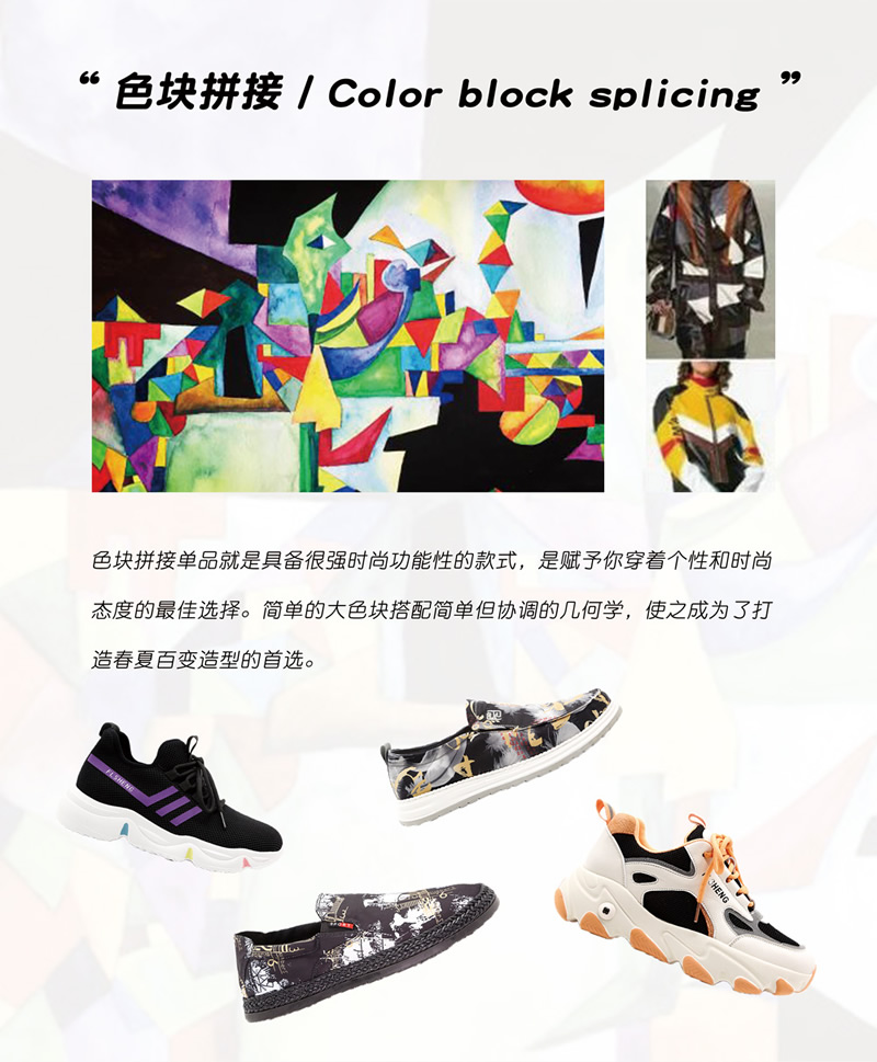 色塊拼接的時尚之路繼續(xù)前行,更多創(chuàng)意的拼接展現(xiàn)不同風(fēng)格的時尚元素,色塊和線條往往能夠成為鞋子亮眼的時尚點(diǎn)。